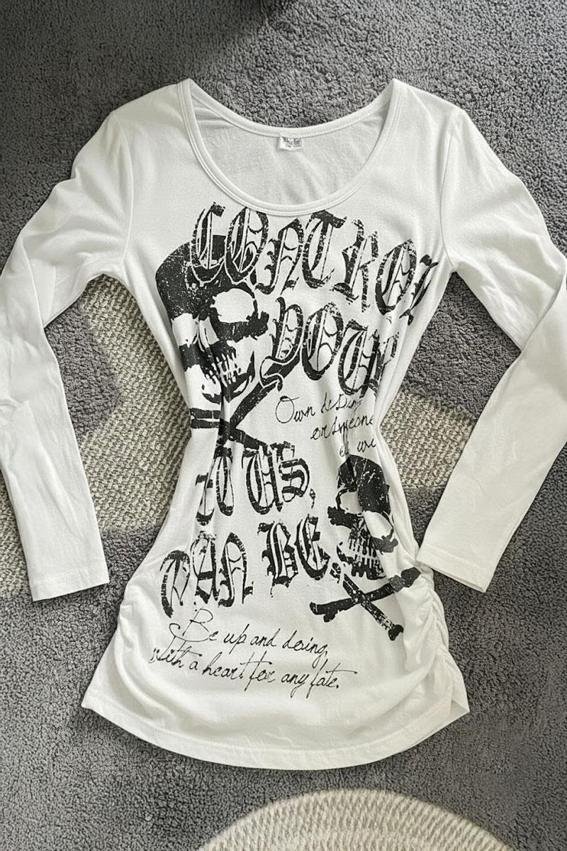 Beyaz Gotik Skulls Control Geniş Yaka Y2K Uzun Kollu Crop