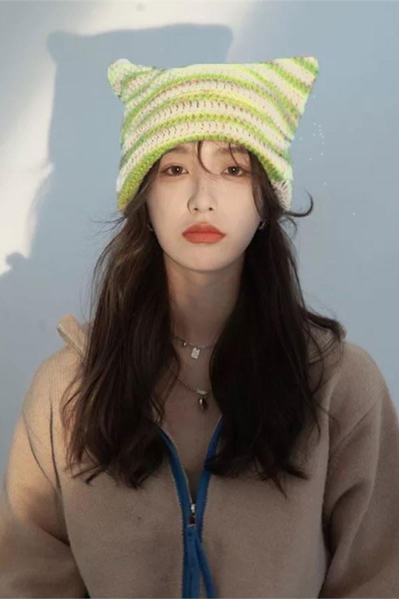 Yeşil Beyaz Çizgili Boynuz Detaylı Örgü Bere (KBR706)